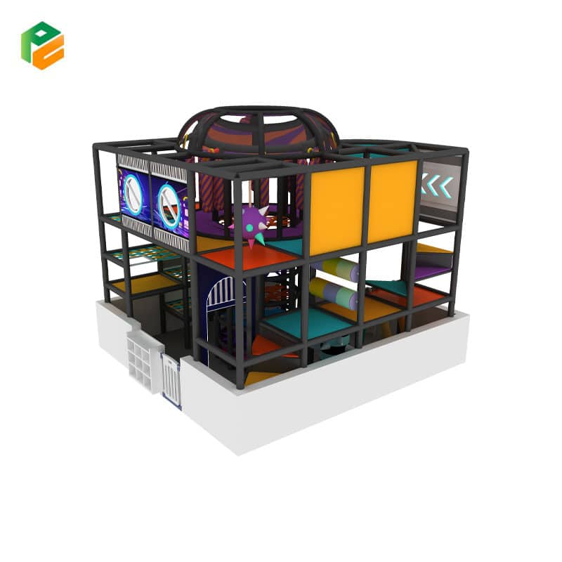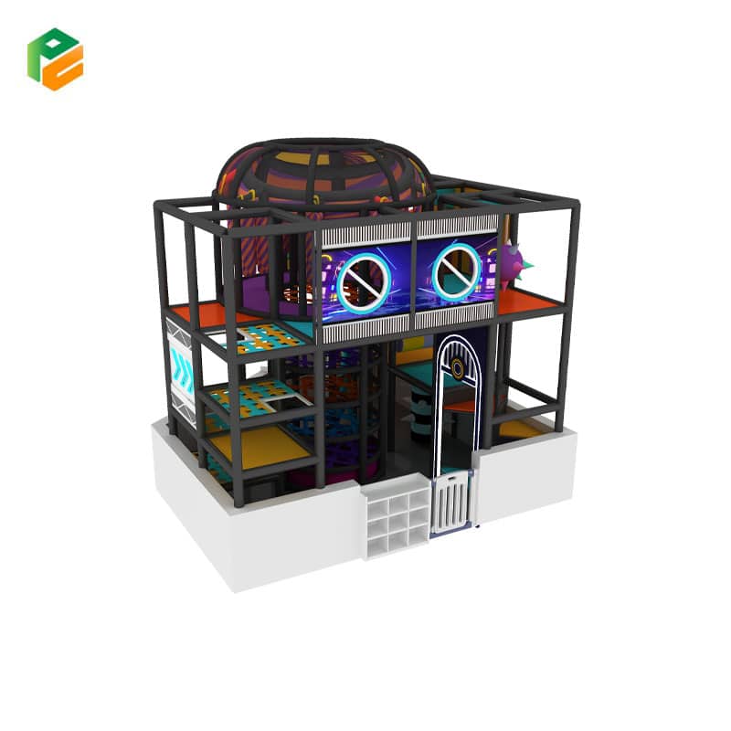 Step into the future of active play. The Neo-Chrome Adventure Pavilion is a visually striking, high-density play structure designed for modern entertainment centers. Featuring a unique central vertical climbing cylinder and three tiers of complex obstacles, this model trades traditional pastels for a bold, futuristic “Cyber” aesthetic. Its compact, corner-friendly footprint is engineered for maximum play value in a focused area, making it an ideal “signature piece” for venues looking to appeal to both kids and pre-teens.