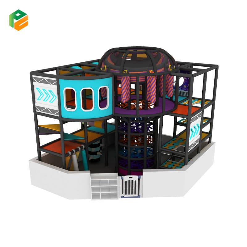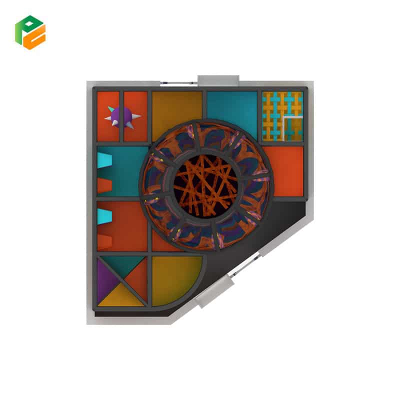 Core Components 3-level padded grid structure. Central cylindrical tower featuring a multi-story elastic “spider-web” climbing matrix. Upper-level observation dome with hanging padded punch bags. Suspended spiked-ball obstacle. Horizontal squeeze rollers. Arcade/retro-themed graphic panels. Integrated white perimeter boundary wall featuring a secure access gate and built-in shoe cubbies