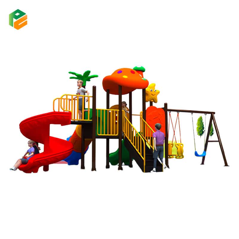| Core Components | 2-bay attached swing frame (includes 1 blue standard belt seat and 1 yellow enclosed toddler seat), large orange mushroom roof with colorful dots, yellow starfish pole topper, green palm tree topper, green double-lane straight slide, colorful multi-segment tube slide (yellow/orange/blue), red spiral slide, wide-step access stairs with yellow safety handrails, red “apple” barrier panel, and multiple non-slip square platforms |