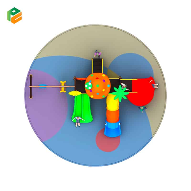 | Max Capacity | 10 – 14 Children (Determined by multi-zone engagement: accommodates 2 children on the swings, 4 children simultaneously using the three slide routes [double green, tube, and spiral], 2-4 children navigating the platforms, and 2-4 queuing on the stairs or engaging with ground-level panels) |