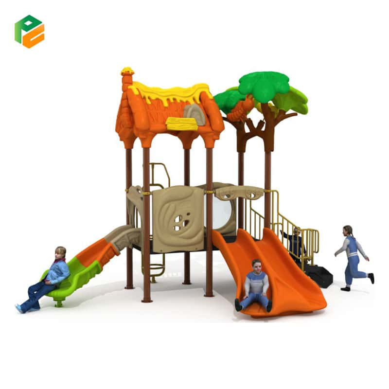 Core Components Orange and yellow cottage-style roof with chimney detail, orange double wavy slide, orange and green single wavy slide, decorative tree-canopy post topper (brown trunk and green leaves), access stairs with safety handrails, vertical rung climbing ladder, circular clear bubble observation panel, and elevated play platforms with textured safety panels