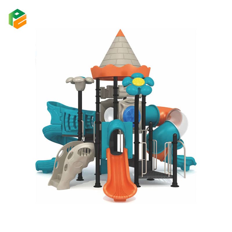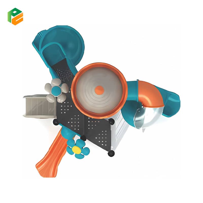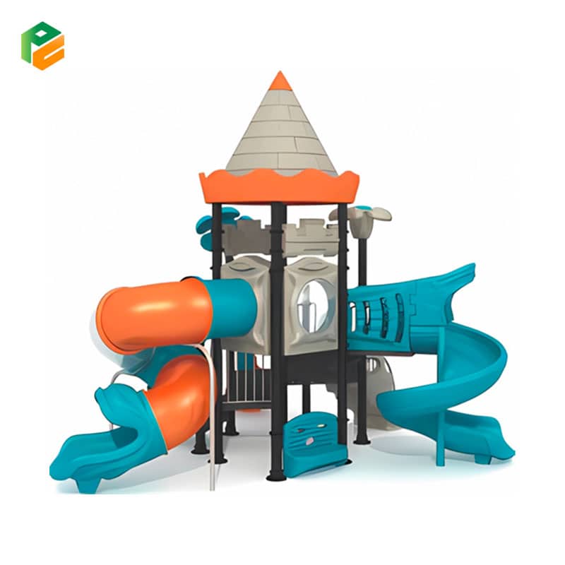 An outdoor playground featuring one big tunnel slide, one spiral slide, one single slide, and one plastic chair is an exhilarating and imaginative play space for children. The highlight is the big tunnel slide, providing a thrilling and adventurous descent. A spiral slide adds a twist to the fun, while a single slide offers a more straightforward sliding experience. The inclusion of a plastic chair allows for creative role-play scenarios and relaxation. This diverse combination of elements encourages physical activity, creativity, and social interaction, making it an exciting and well-rounded outdoor playground.