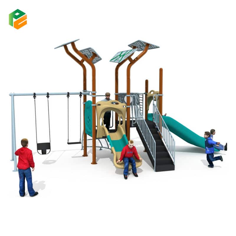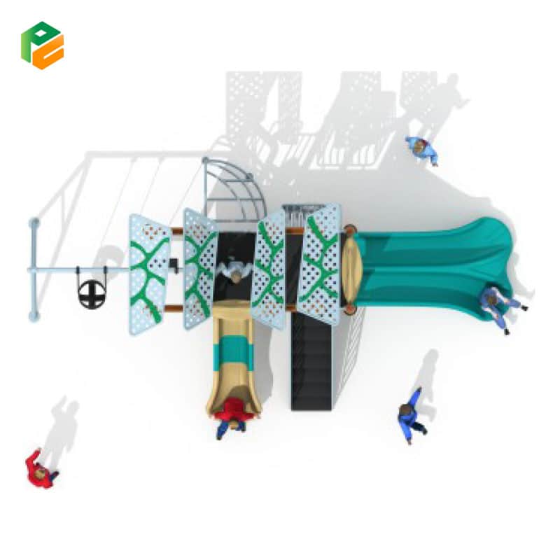Core Components Nature-inspired “branch and leaf” perforated metal shade structures, 2-person swing set (includes 1 belt seat and 1 infant bucket seat), teal single wavy slide, tan double slide, access stairs with safety handrails, arched metal rung climber, and elevated play platforms with protective panels