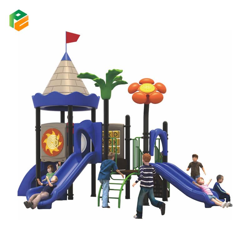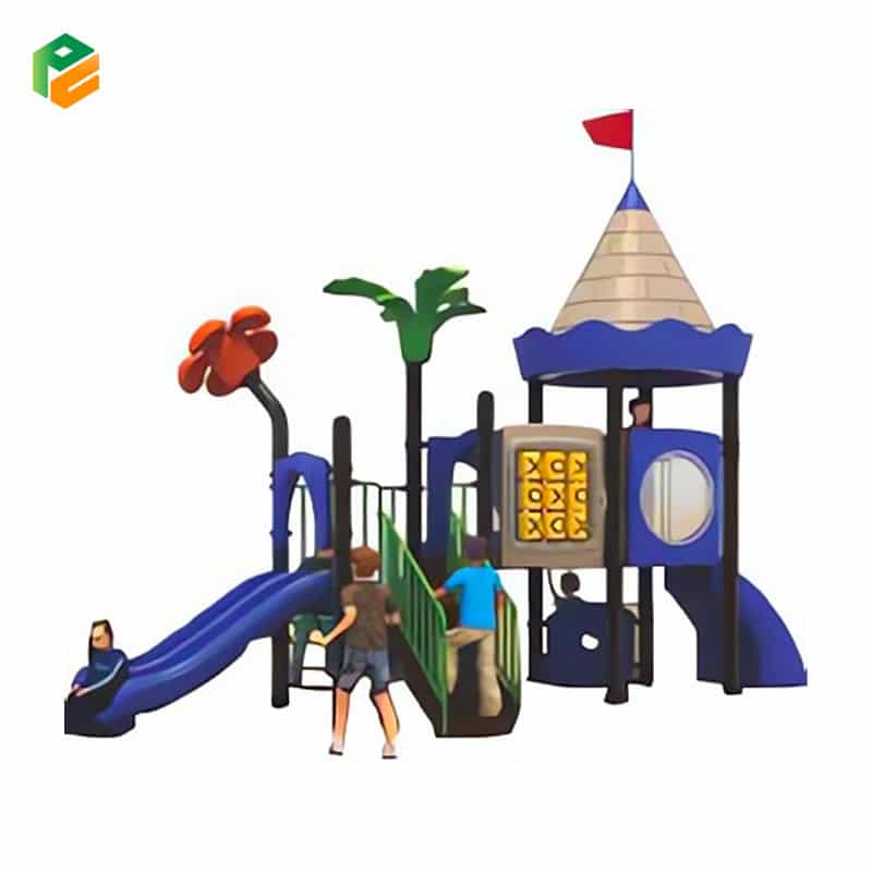 Castle-themed outdoor playground equipment with a captivating design, featuring a double slide for thrilling descents, a single slide for solo adventures, a durable plastic climbing frame for imaginative play, and a robust metal climbing frame for exciting physical challenges. This enchanting playground encourages active play and imaginative exploration while providing hours of fun for children.