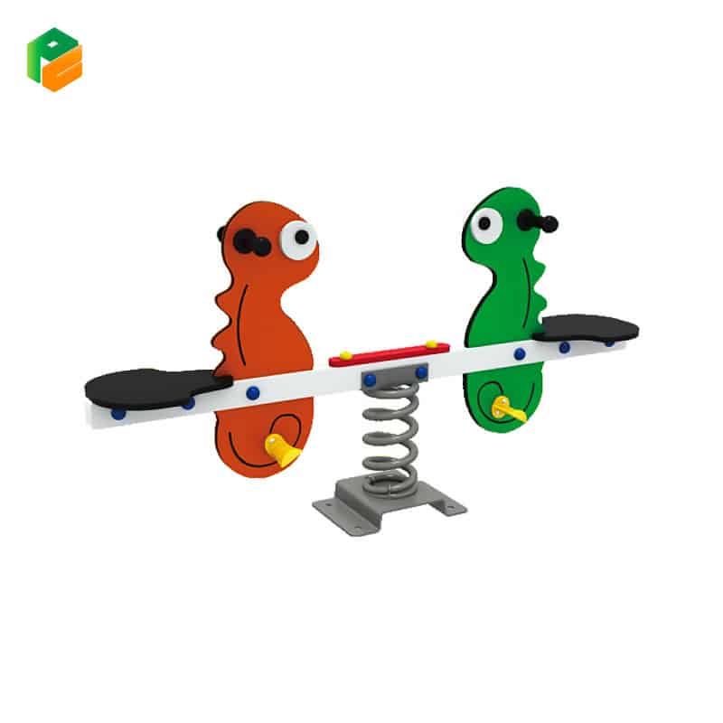 Introducing our chameleon-shaped two-seated seesaw, a delightful addition to any playground. Crafted with durable powder-coated galvanized steel, the supportive structure ensures stability and longevity. Each seat, molded from durable and strong HDPE material, provides a comfortable and secure ride for children. With its whimsical chameleon-shaped figures and spring feature, this seesaw adds an extra element of fun and excitement to playtime. Perfect for encouraging imaginative play and social interaction, it’s sure to be a favorite among young adventurers.