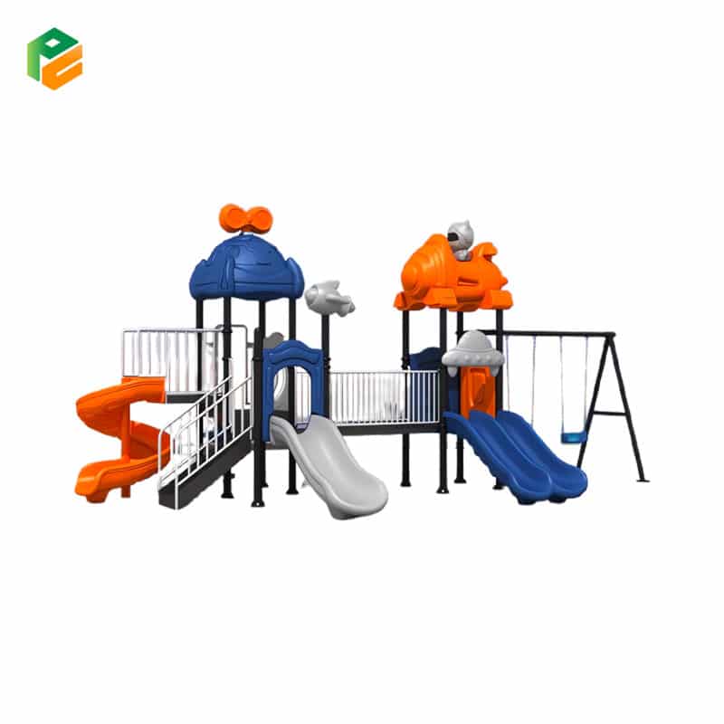 | Core Components | Two main play towers connected by a platform bridge. Blue dome roof with an orange propeller topper, orange spaceship roof featuring a grey astronaut, grey rocket ship pole toppers. Blue double-lane straight slide, grey single straight wavy slide, orange spiral slide. 2-bay attached swing frame (1 blue and 1 orange standard belt seat). Wide-step access stairs with white safety handrails, white vertical pipe bridge enclosures, blue astronaut bear barrier panel, orange rocket ship barrier panel, grey window panel, and non-slip square platforms |