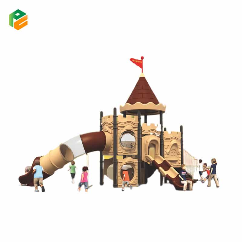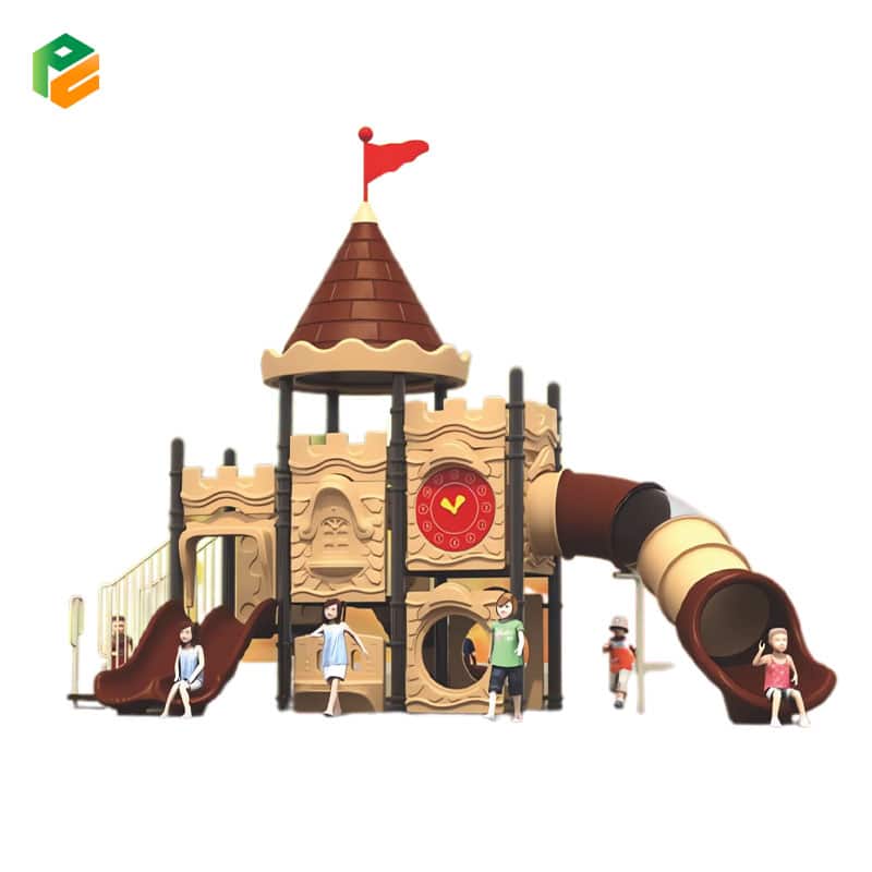 The children’s outdoor play castle is a captivating structure designed to ignite young imaginations. This castle-themed playset offers an exhilarating array of slides, including a big tunnel slide for thrilling adventures, a double slide for friendly races, and a single slide for individual excitement. Kids can explore, slide, and play, creating lasting memories of fun and adventure in a safe and engaging outdoor environment.