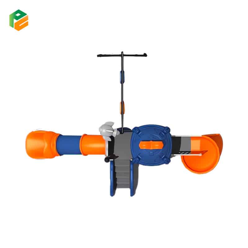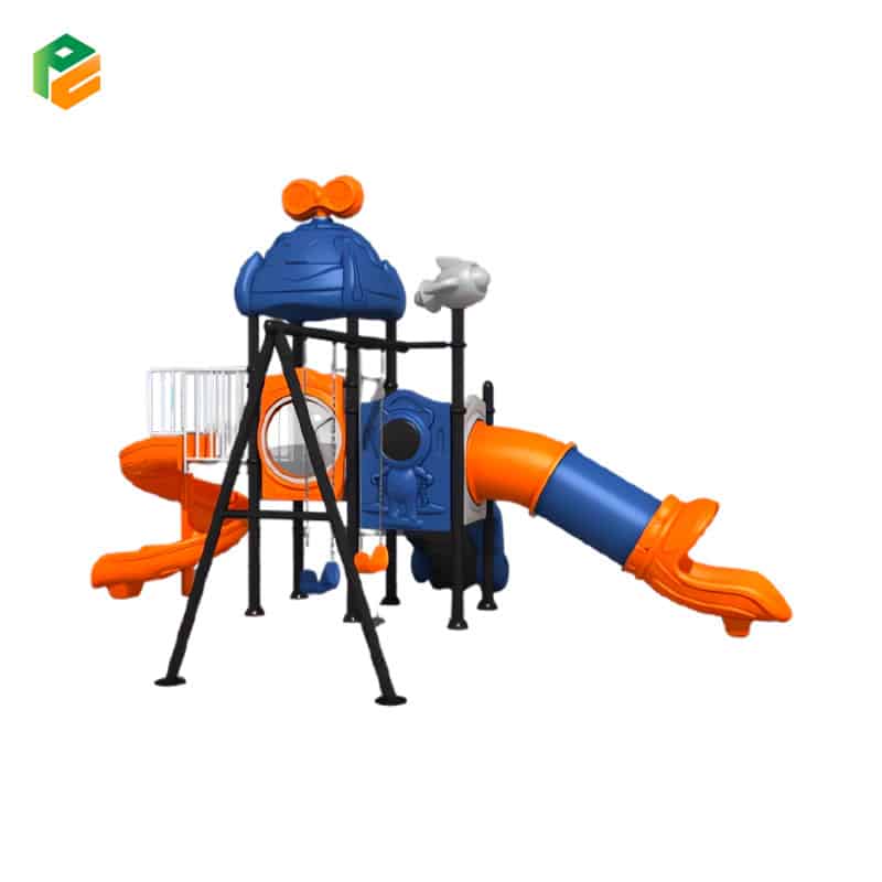| Core Components | Blue “spaceship/UFO” dome roof with an orange radar/propeller topper, grey rocket ship pole topper. Orange and blue multi-segment tube slide, orange spiral slide. 2-bay attached swing frame (featuring 2 blue standard belt seats). Wide-step access stairs with blue molded safety sidewalls, grey barrier panel with an astronaut graphic, orange barrier panel with a transparent bubble window, white vertical pipe safety barriers, and non-slip platforms |