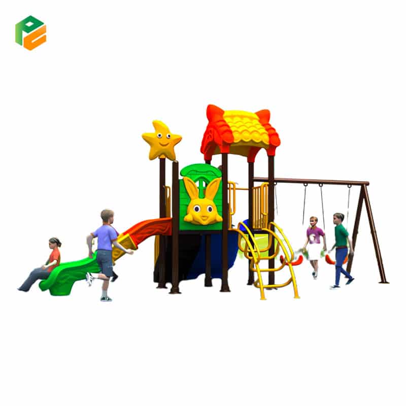 | Core Components | Red and yellow house-style roof with animal ear details, yellow starfish pole topper. Blue double-lane straight slide, multi-segment wavy slide (red/yellow/green). 2-bay attached swing frame (featuring 2 orange standard belt seats). Wide-step access stairs with yellow safety handrails, yellow arched loop ladder climber. Green barrier panel with a 3D yellow rabbit character, and a non-slip square platform |