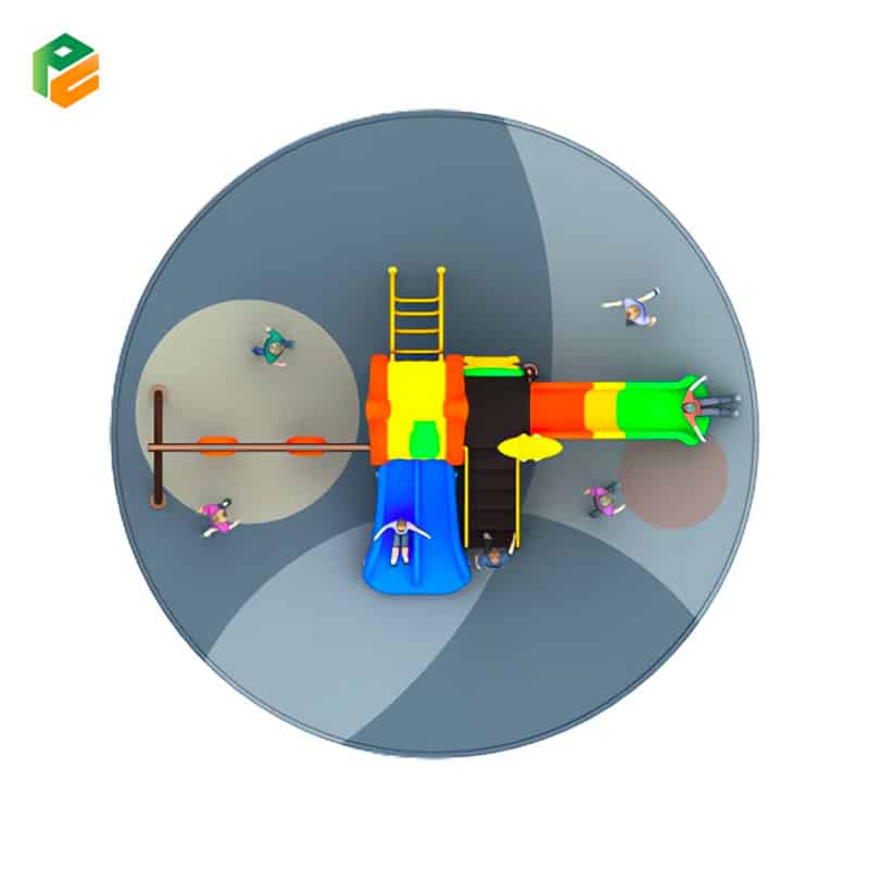 | Safety Area | 840 × 680 cm (Calculated per EN 1176-1 & EN 1176-2: Requires a minimum 1.5m clearance on structural sides, a 2.0m exit zone for the slide runouts, and an extended forward/backward dynamic clearance zone for the swing set arc) |
