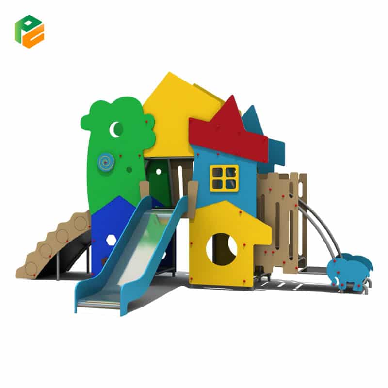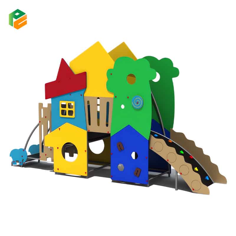 Core Components Abstract “village” facade with multi-colored (yellow, red, blue) house-shaped panels, light blue straight wavy slide, wave-contoured climbing ramp with textured foot-holds, blue “elephant” character slide entry/exit stabilizers, green tree-shaped decorative panels with spinning gear/flower details, integrated “rock-climb” style footholds on side panels, porthole windows and house-window cutouts, and multiple elevated play platforms