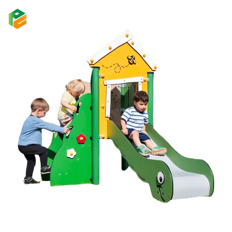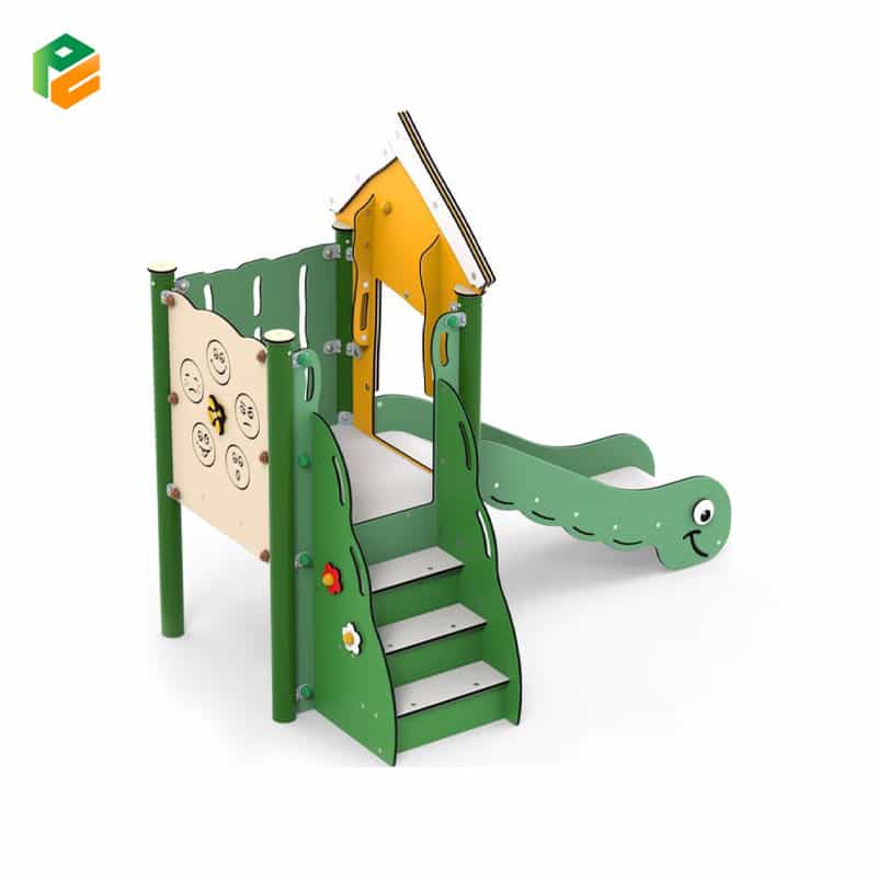 Core Components Character-themed green wavy slide with a “caterpillar” face graphic on the side profile, yellow gabled playhouse roof with white trim and bee decorative accents, green side panels with decorative flower and bee relief carvings, integrated wide-step access stairs with anti-slip surfaces, beige activity panel with circular “nature” themed engravings, and an elevated square play platform