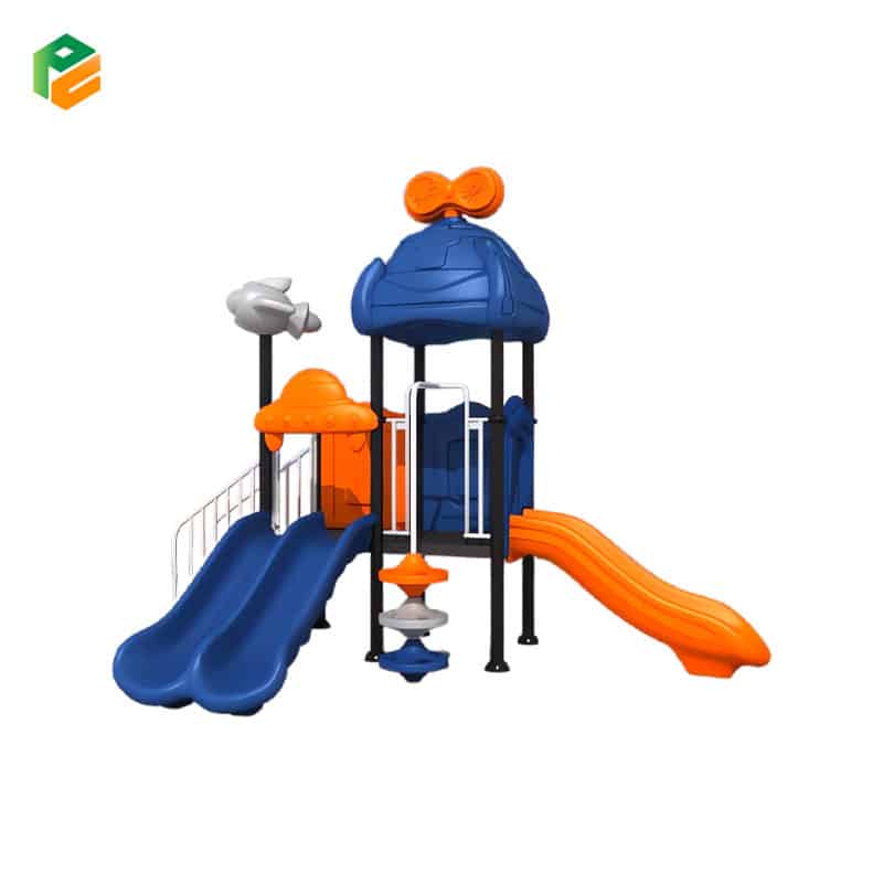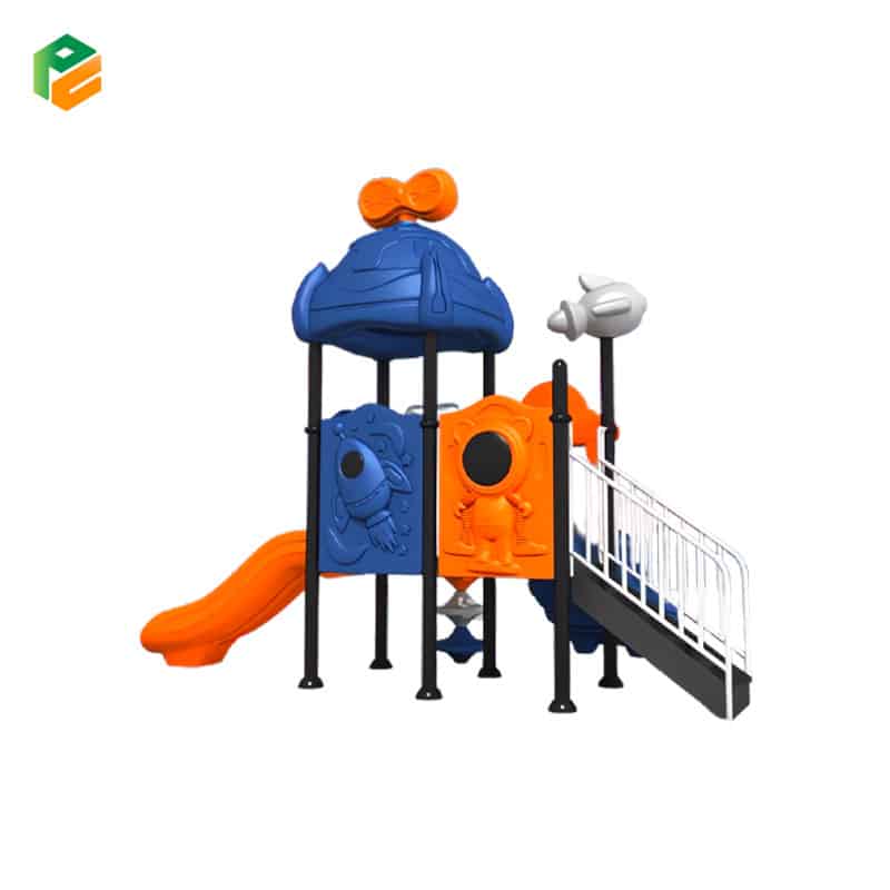 This compact outdoor playground set features an exciting space theme, complete with slides and imaginative design elements to spark children’s curiosity and creativity. The main supportive structure is constructed from durable galvanized steel pipes with a diameter of 89mm, ensuring long-lasting stability and safety. The vibrant plastic components are made from high-quality LLDPE, offering UV resistance and smooth, child-friendly surfaces.