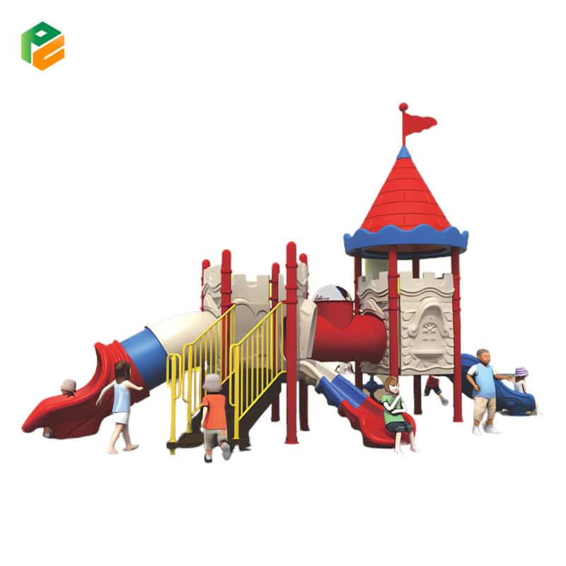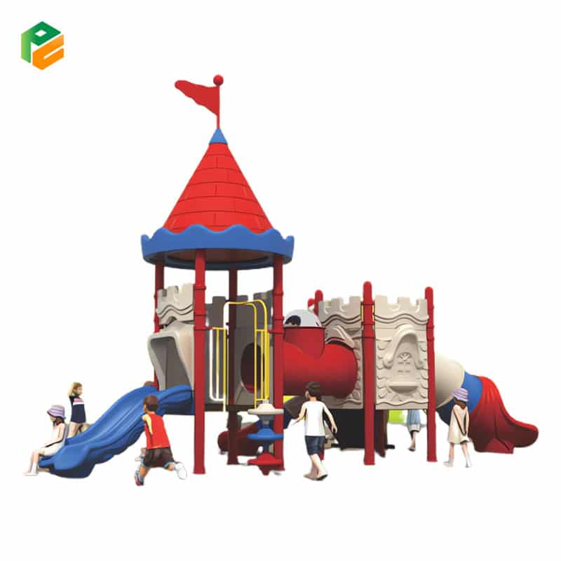 This cool outdoor play equipment with a castle theme is a fantastic play structure designed to spark children’s imaginations. Resembling a majestic castle, it offers an array of exciting activities, including a tunnel slide for thrilling adventures, a double slide for friendly races, a single slide for individual fun, and a plastic tunnel that connects one platform to the other, fostering exploration and creativity. This castle-themed play equipment provides a safe and enjoyable space for children to engage in active play and embark on royal adventures.