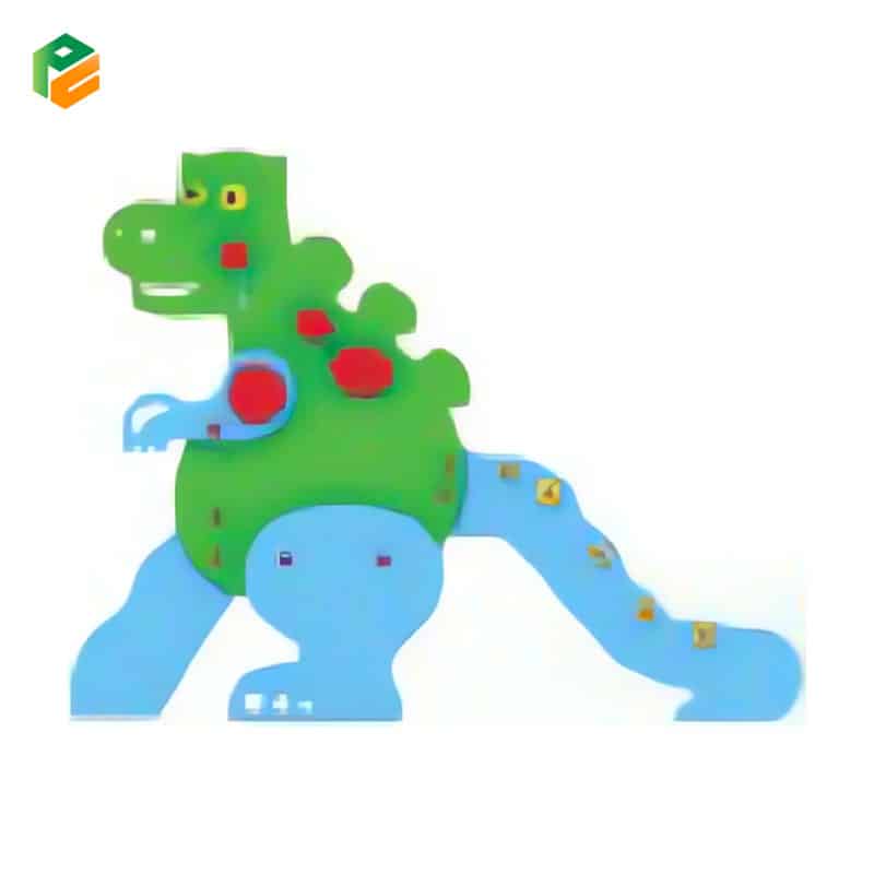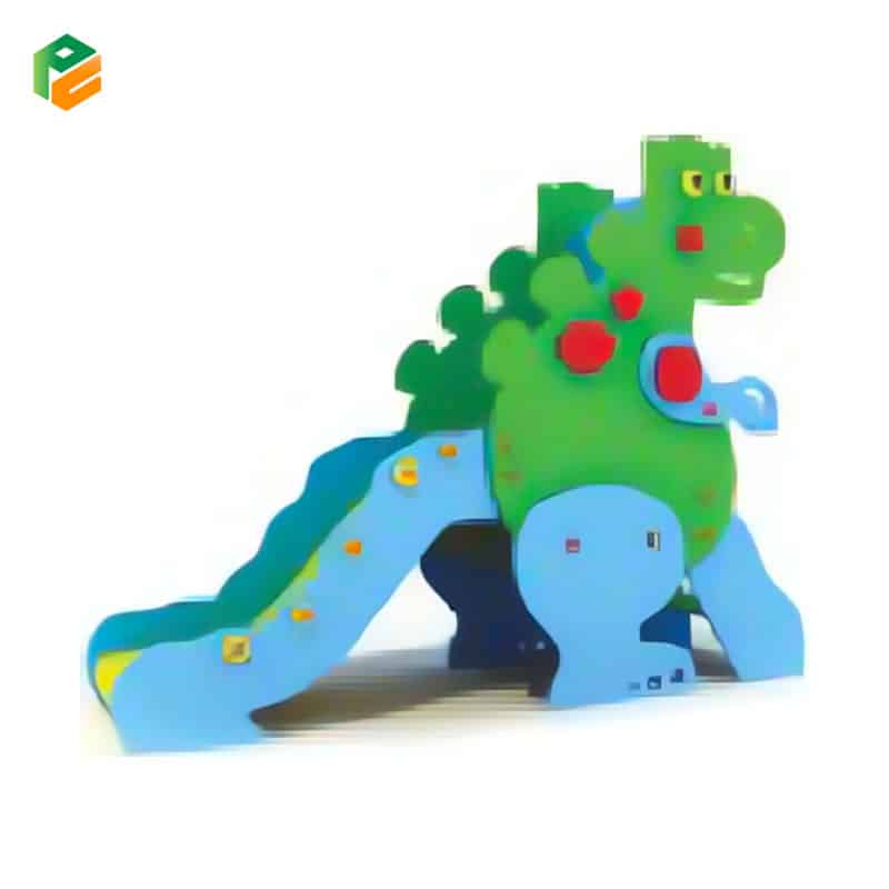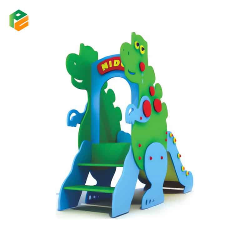 Core Components Integrated “Dinosaur” profile panels in bright green and blue, short straight slide with character-themed safety sidewalls (acting as the dinosaur’s tail), wide-step toddler access ladder with anti-slip surface, decorative red spinal plates and yellow circular “spots,” arched “NID” entry header, and a secure elevated platform
