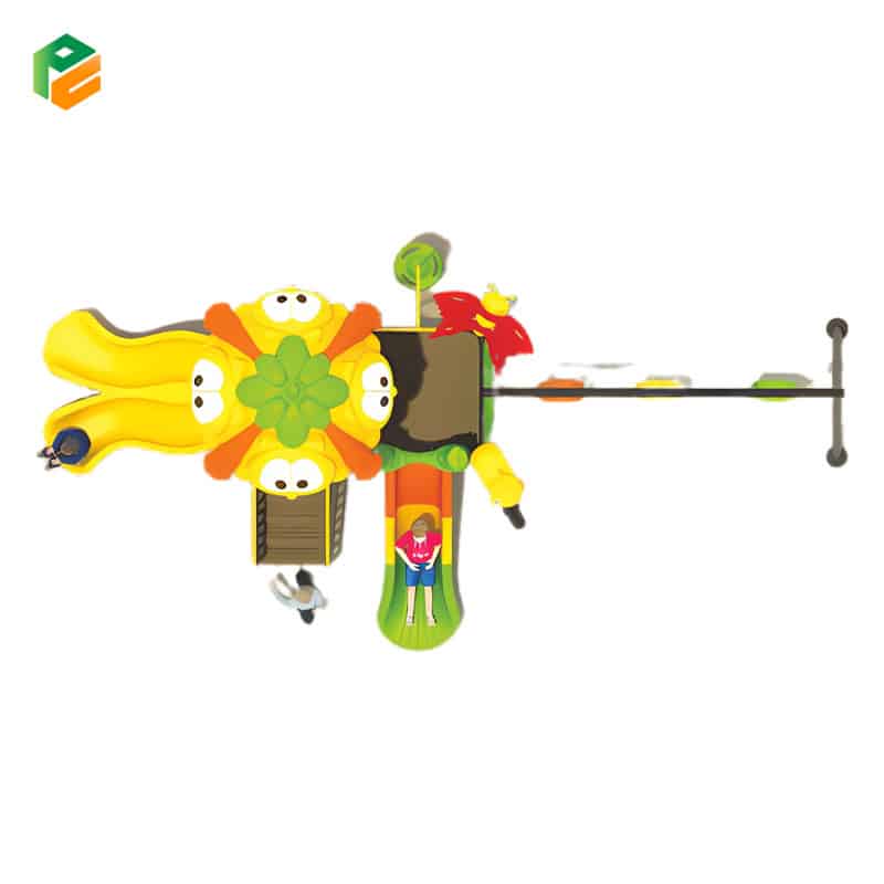 The outdoor playground slide with a charming dog head-shaped roof is a delightful play structure designed to capture children’s imagination. It features a whimsical design with the roof resembling an adorable dog’s face. This playful playground offers a variety of activities, including a 3-person swing set for cooperative swinging fun, a double slide for thrilling descents, and a single slide for individual adventures. It creates a fun and safe space for children to enjoy outdoor play, encouraging social interaction, physical activity, and imaginative play.