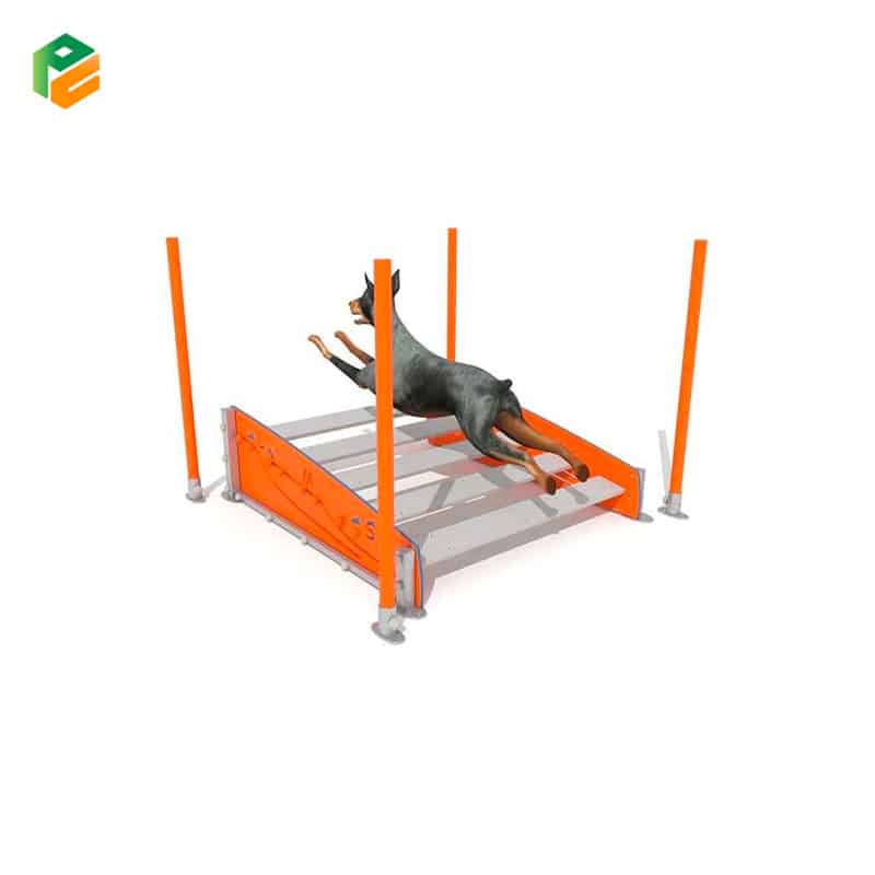 • Anti-slip rubber covered jump slats can be adjusted to the different dog categories through a rail system.