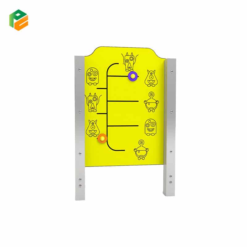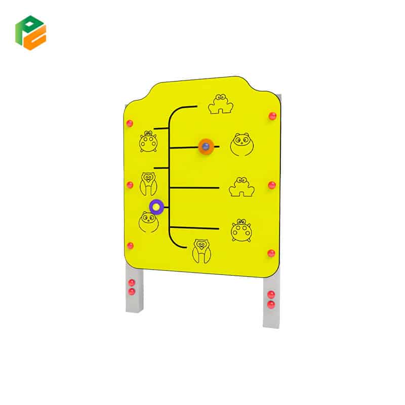 This double-sided play panel is designed to be accessible and inclusive, allowing children to engage by matching various pairs of images engraved on its surface. The panel features two movable parts that glide along rails, enabling kids to connect the images.