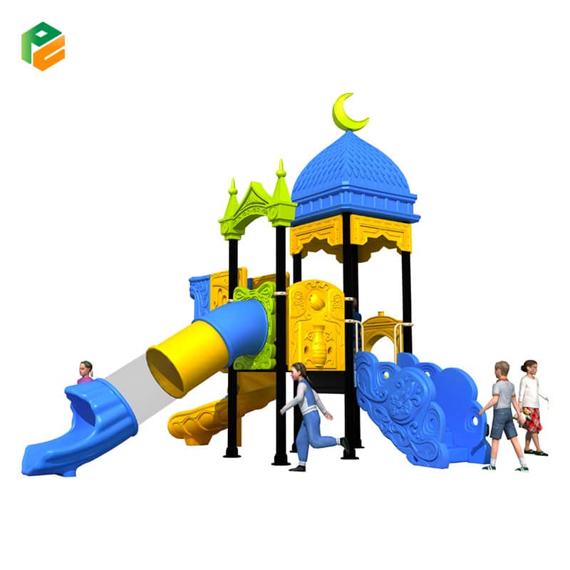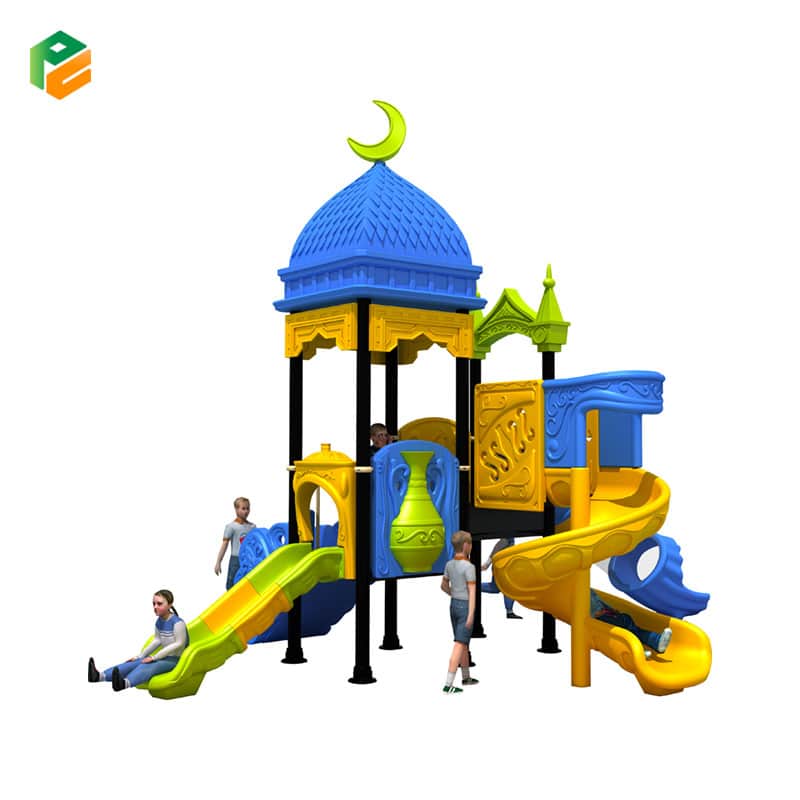 Core Components Middle Eastern-inspired blue dome roof with a yellow crescent moon finial, green and yellow decorative architectural arches, blue and yellow crawling tunnel, yellow spiral slide, green and yellow single wavy slide, wide blue access stairs with intricate embossed patterns, yellow and blue safety panels featuring vase and abstract motifs, black square play platforms, and black main support posts