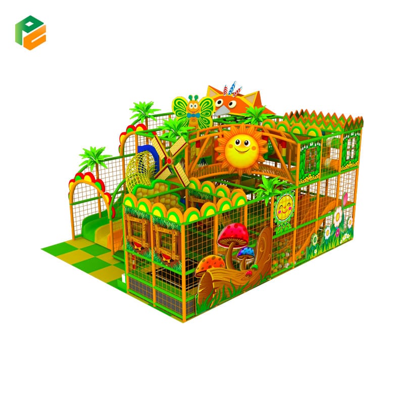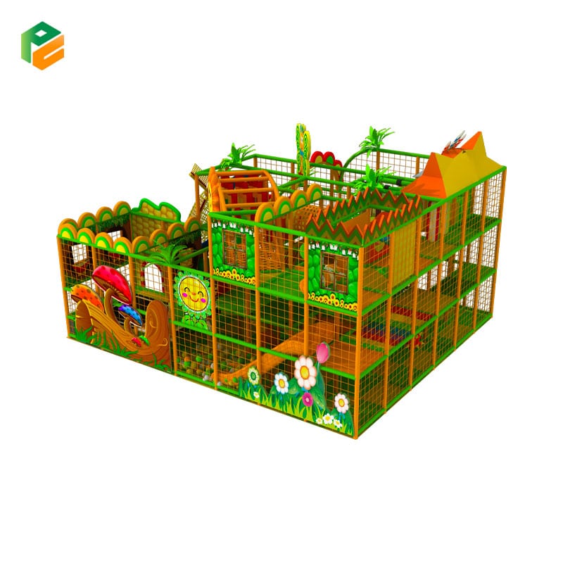 Immerse children in an adventure with our forest-themed large indoor soft play area. Spanning three floors, this play area is constructed from durable galvanized steel pipes and LLDPE (Linear Low-Density Polyethylene) plastic, ensuring a safe and lasting environment. It features a huge triple slide, trampoline, ball pit, climbing net, and more, all designed to capture the essence of a lush forest. This expansive and interactive play space encourages exploration and physical activity, making it a perfect addition for any venue looking to provide a captivating and adventurous experience for children.