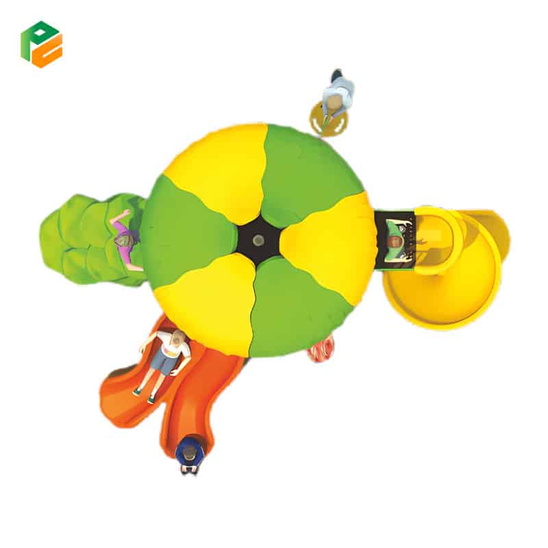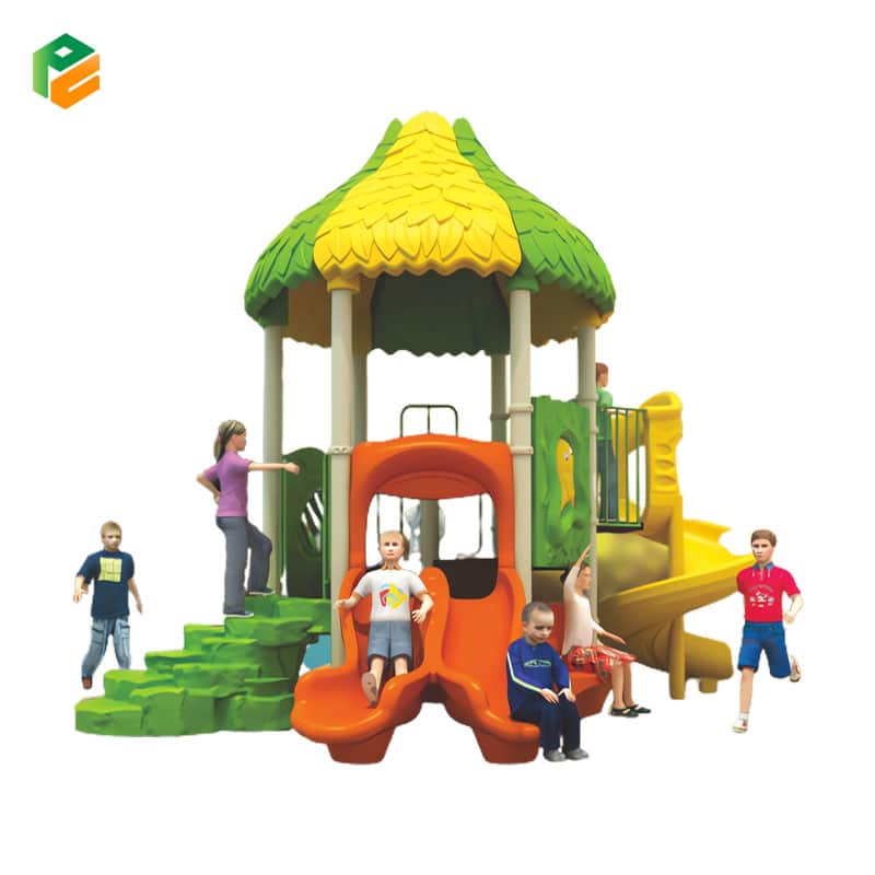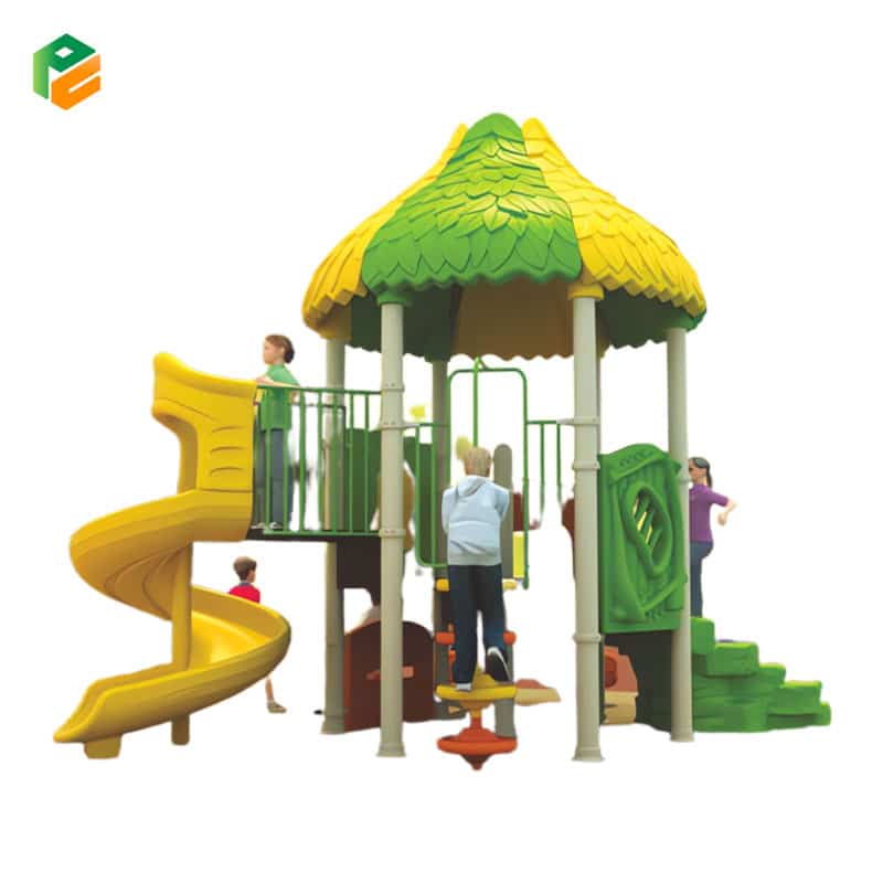 The outdoor plastic playset is a dynamic and versatile play structure designed for kids to have a blast. It features a hexagonal platform at its center, providing a spacious and stable play area. The playset boasts a thrilling spiral slide and an exciting double slide, perfect for adventurous descents. Additionally, it includes plastic climbing discs for developing motor skills and balance, a convenient plastic bench for rest, and a stone-like staircase for an element of natural charm. This playset offers a diverse range of activities, fostering active play and creative adventures in an inviting outdoor setting.
