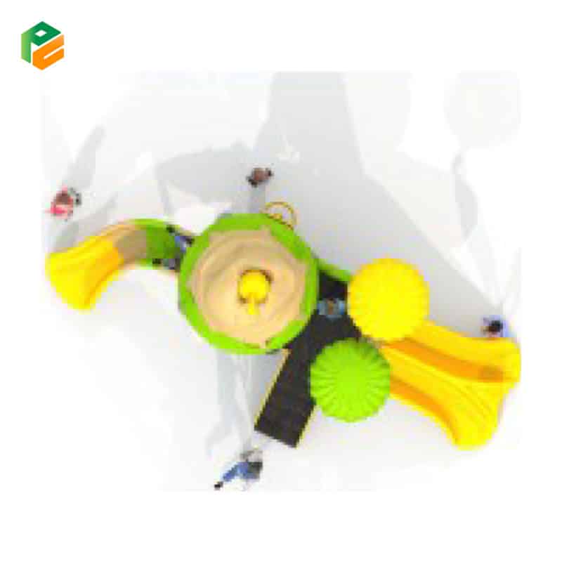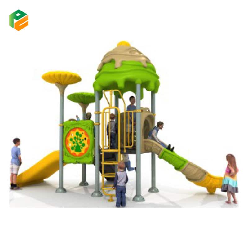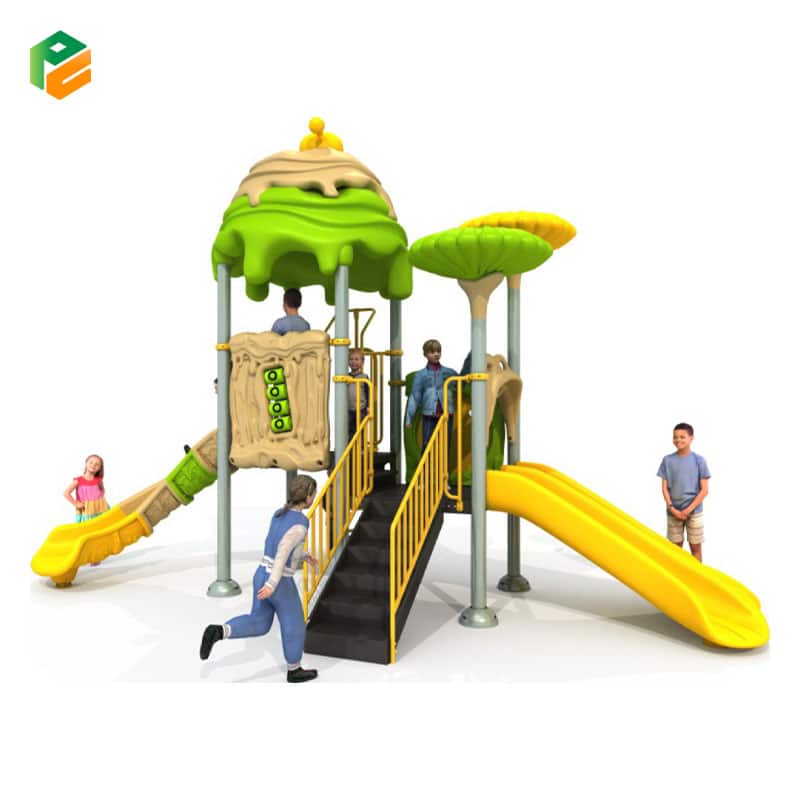 The ice cream-themed outdoor playground is a delightful and whimsical play area designed to capture the imaginations of school kids. Resembling a giant ice cream cone, it features both a double slide and a single slide, providing options for thrilling descents and individual excitement. This creative playground adds a sweet touch to outdoor play, offering an entertaining and safe space for kids to engage in active play while indulging their imagination.