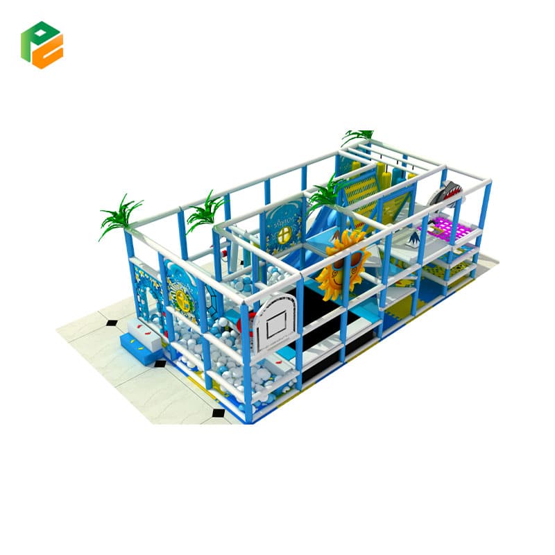 Our indoor jungle gym, tailored for kindergartens, offers a vibrant and engaging play space for young children. Built with durable galvanized steel pipes and LLDPE (Linear Low-Density Polyethylene) plastic, this jungle gym ensures a safe and long-lasting environment. It includes a ball pit, single slide, basketball hoop, swing set, and other playful features that encourage active fun and social interaction. This compact yet dynamic play area is perfect for kindergartens looking to create a lively and safe environment for young explorers.
