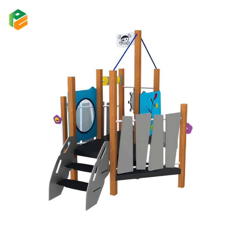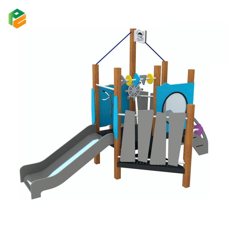 Core Components High-durability straight slide with a stainless steel bed and grey HDPE sidewalls, pirate-themed mast with a “Skulls & Crossbones” flag and blue tension cables, interactive ship’s wheel (grey), spinning gear/abacus play station (yellow/blue/grey), porthole viewing window, grey “ship hull” plank panels, blue decorative facade panels with relief carvings, wide-step access stairs with anti-slip surfaces, and a reinforced non-slip play deck