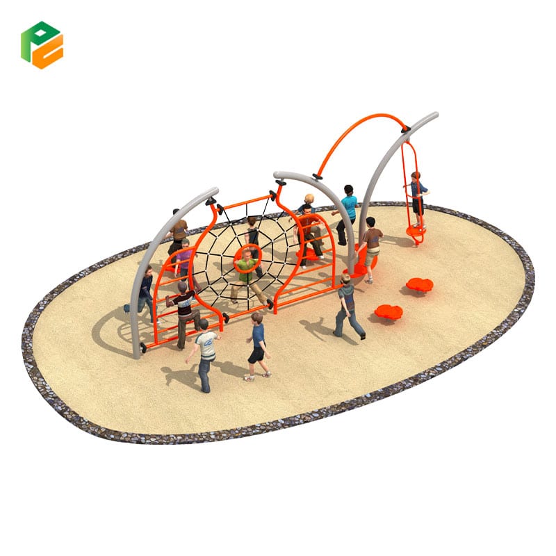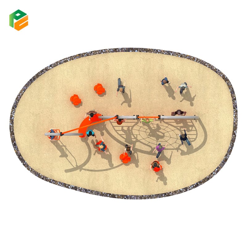 | Max Capacity | 8 – 14 Children (Determined by open-play flow: safely accommodates 4-6 children actively navigating the central spiderweb net and lateral ladders, 1-2 utilizing the suspended drop pole, and 3-6 engaging with the balancing stepping pods and curved seating platform) |
