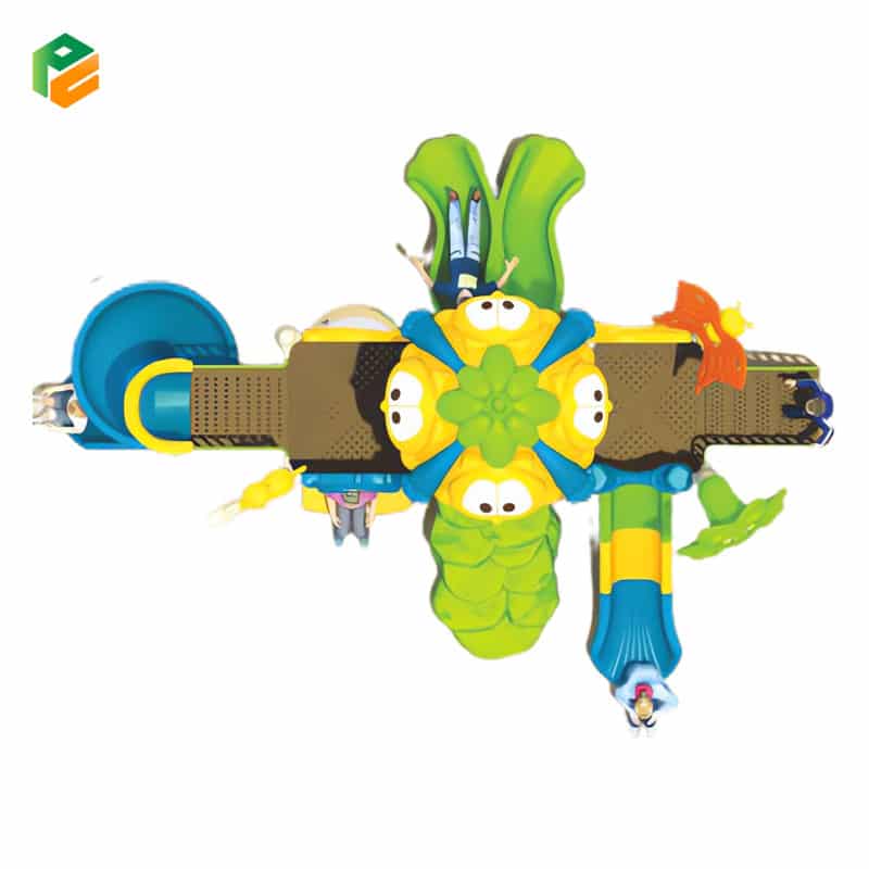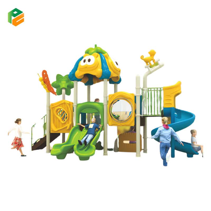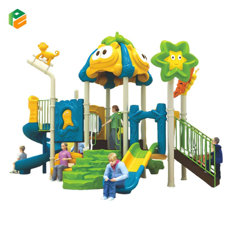 The kindergarten outdoor play equipment is a whimsical and engaging play structure that captures the imagination of young children. It features a charming cartoon-themed roof, adding a playful touch to the environment. This dynamic playset offers three exhilarating slides, including a spiral slide for twists and turns, a double slide for friendly races, and a single slide for individual adventures. Moreover, it incorporates a plastic stair designed to resemble stone, adding a natural element to the design. This versatile outdoor equipment provides a fun and safe space for kindergartners to enjoy active play and creative exploration.