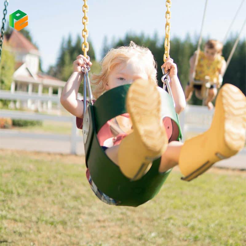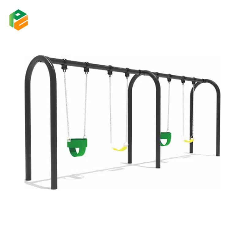 Materials Galvanized steel frame with electrostatic powder coating; Hybrid mix of HDPE bucket seats and EPDM rubber belt seats with galvanized chains