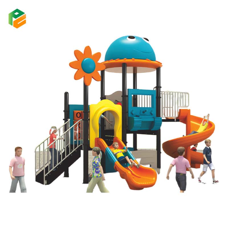 The metal and plastic outdoor playground for daycare is a well-crafted play area perfect for young children. This playground features a spiral slide for thrilling descents, a single slide for individual adventures, and a convenient plastic bench under the platform for a comfortable break. Its sturdy metal and plastic construction ensures durability, making it an ideal choice for daycare centers where kids can have hours of safe and active play while enjoying the outdoor environment.