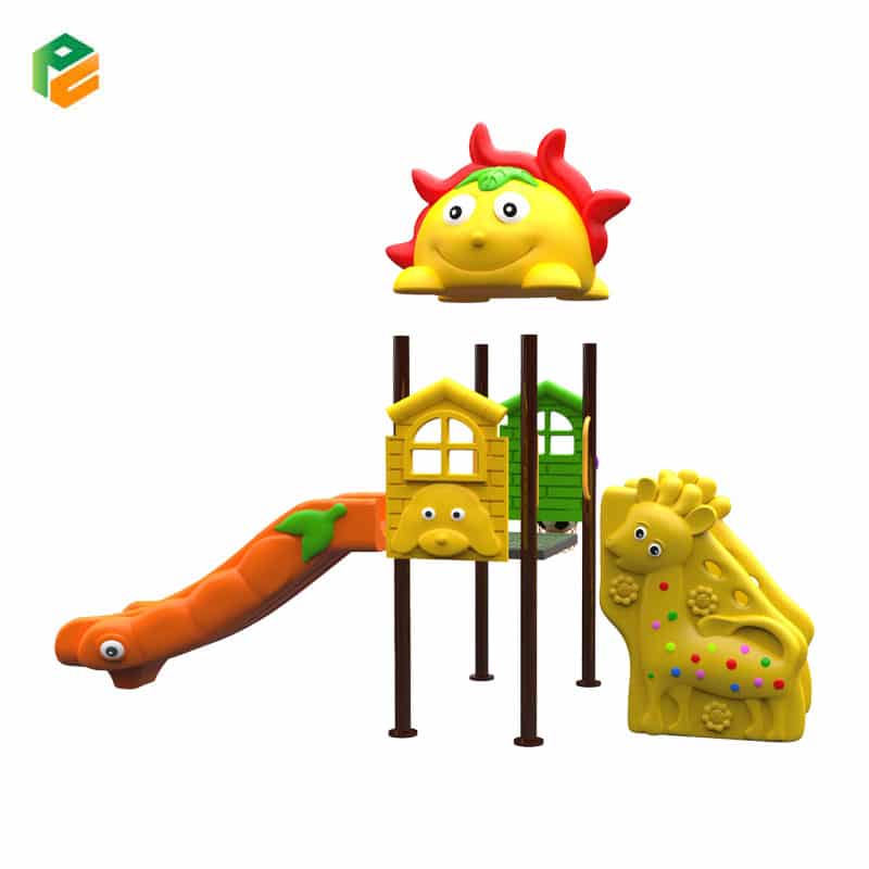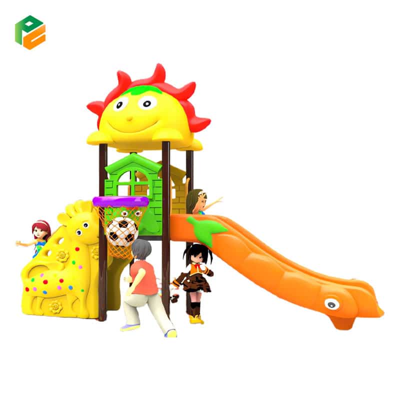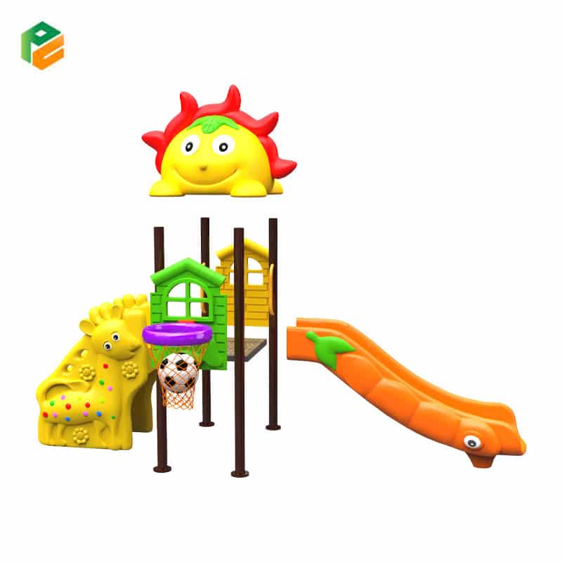 Core Components Yellow “Sun” roof with red sunbeams/petals. Orange single straight slide featuring a green leaf and character eye (carrot/caterpillar theme). Green house-shaped barrier panel with an attached purple basketball hoop and net. Yellow house-shaped barrier panel with a dog face. Large yellow giraffe ground-level decorative panel, and a single low-elevation non-slip square platform