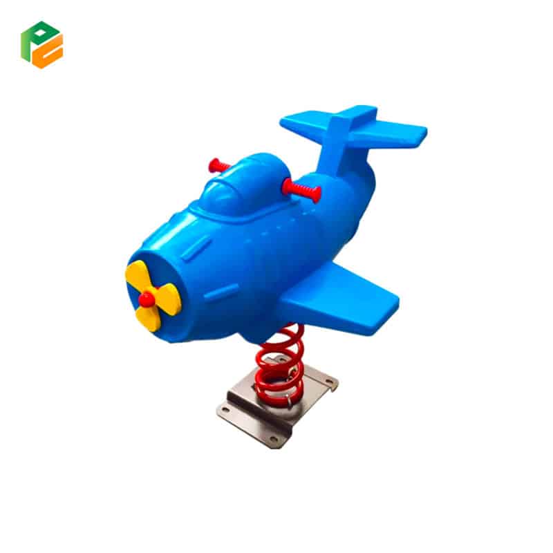 The Outdoor Airplane Sit-On Spring Rider for parks features a captivating airplane design made from strong, eco-friendly plastic. Its spring, constructed from powder-coated galvanized steel, ensures superior durability and weather resistance. Perfect for imaginative play, this spring rider offers safe and enjoyable fun for young children.