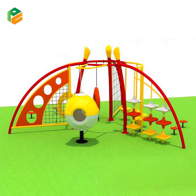 | Max Capacity | 8 – 14 Children (Determined by multi-zone obstacle flow: safely accommodates 2-3 children navigating the rope net, 2-4 traversing the suspended rings and stepping discs, 1-2 utilizing the central spinning chair, and 2-4 engaging with the freestanding spring rider and stepping pods) |