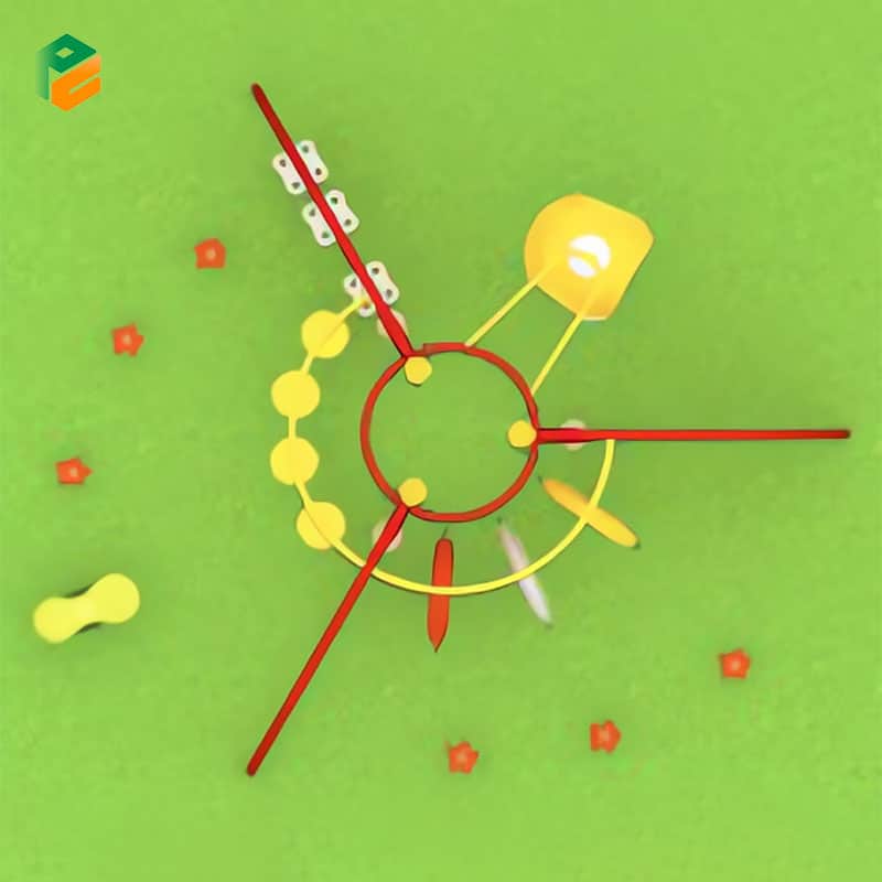 | Core Components | Red and yellow curved steel archways radiating from a central overhead ring. Wing 1: Square vertical rope climbing net attached to an orange structural panel with circular cutouts. Wing 2: Three suspended climbing rings/tires (orange, yellow, grey). Wing 3: Suspended vertical agility traverse with yellow/grey stepping discs. Center: Large yellow and grey spherical LLDPE spinning chair. Freestanding green/yellow seesaw spring rider and red flower stepping pods included |
