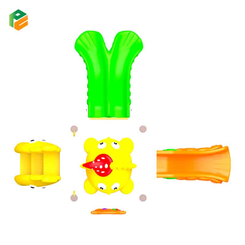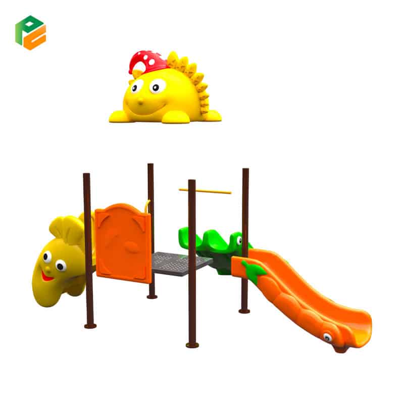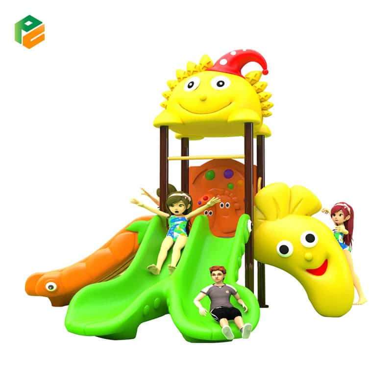 | Core Components | Yellow “Sun” dome roof wearing a red sleeping cap. Green double-lane wavy slide, orange single wavy slide (with green leaf and caterpillar/carrot eye detailing). Large yellow crescent moon/banana character panel on the ground level, orange barrier panel with colorful molded dots/shapes, and a low-elevation non-slip square platform |