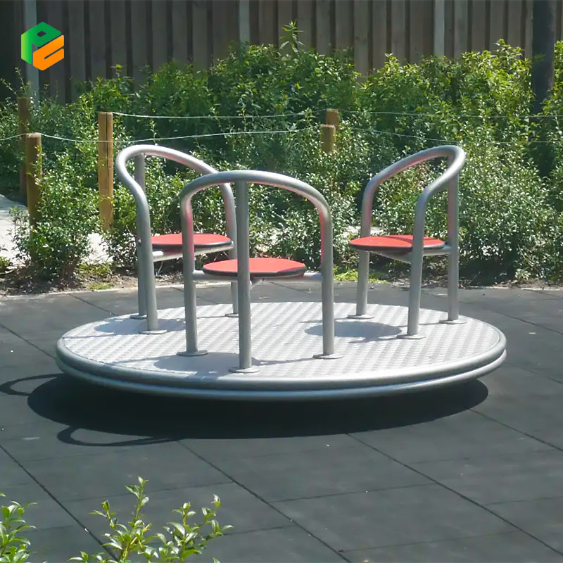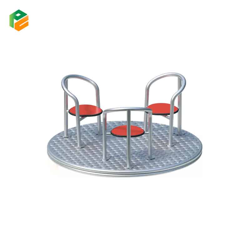 Rotating circular platform with diamond-plate texture; Three ergonomic seats with red finish; Individual curved safety handles for each seat; Precision central bearing for high-stability rotation |