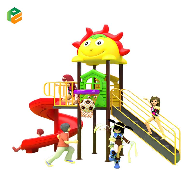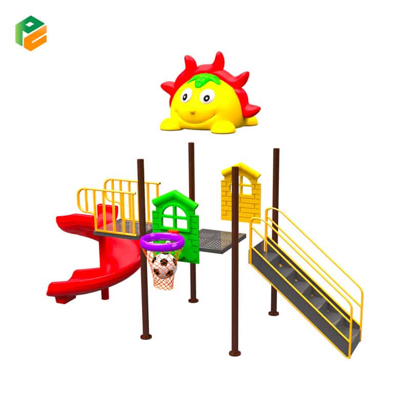 Core Components Yellow “Sun” roof with red sunbeams/rays. Red curved slide. Wide-step access stairs with yellow metal safety handrails. Green house-shaped barrier panel with an attached purple basketball hoop and net, yellow house-shaped barrier panel featuring a dog character face, and two non-slip square platforms
