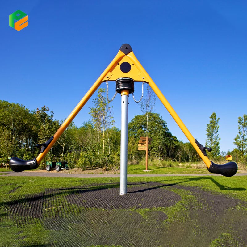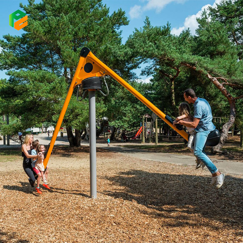 Tailored specifically for the enjoyment of young children, The rotating swing boasts a distinctive design feature: a one-of-a-kind mechanism that sets it apart from traditional swings. This mechanism enables users to engage in a play experience that transcends the typical back-and-forth motion associated with swings. By incorporating the ability to rock in two directions simultaneously while also rotating, The rotating swing provides an immersive and dynamic play experience unlike any other. This multi-directional capability not only adds excitement but also encourages creativity and physical coordination in children.