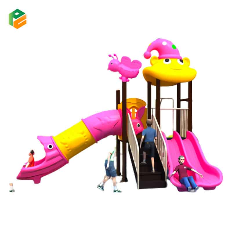 Core Components Yellow character-face roof topped with a pink “sleeping hat” featuring green dots, pink butterfly pole topper. Pink double-lane straight slide, pink and yellow multi-segment tube slide with character eye details. 2-bay attached swing frame featuring a wide, multi-child bench/glider seat. Wide-step access stairs with white safety handrails, yellow under-deck spinning disc/step. Pink barrier panel featuring a rabbit face, yellow house-shaped barrier panel, and low-elevation non-slip square platforms