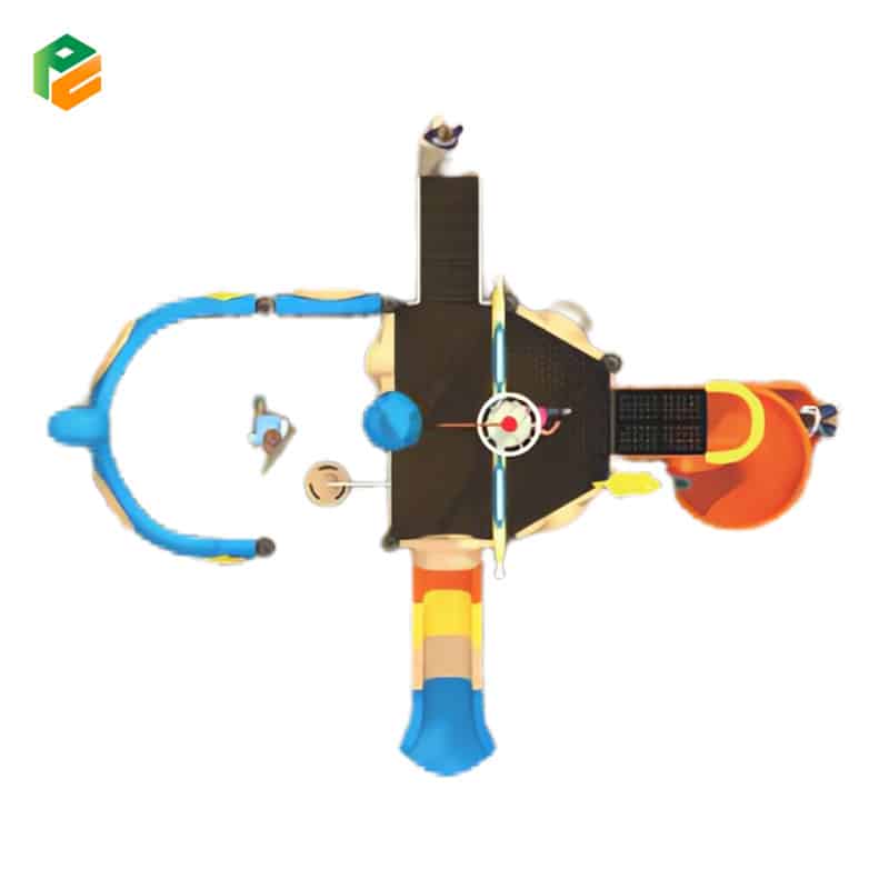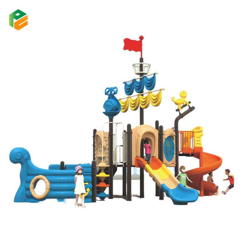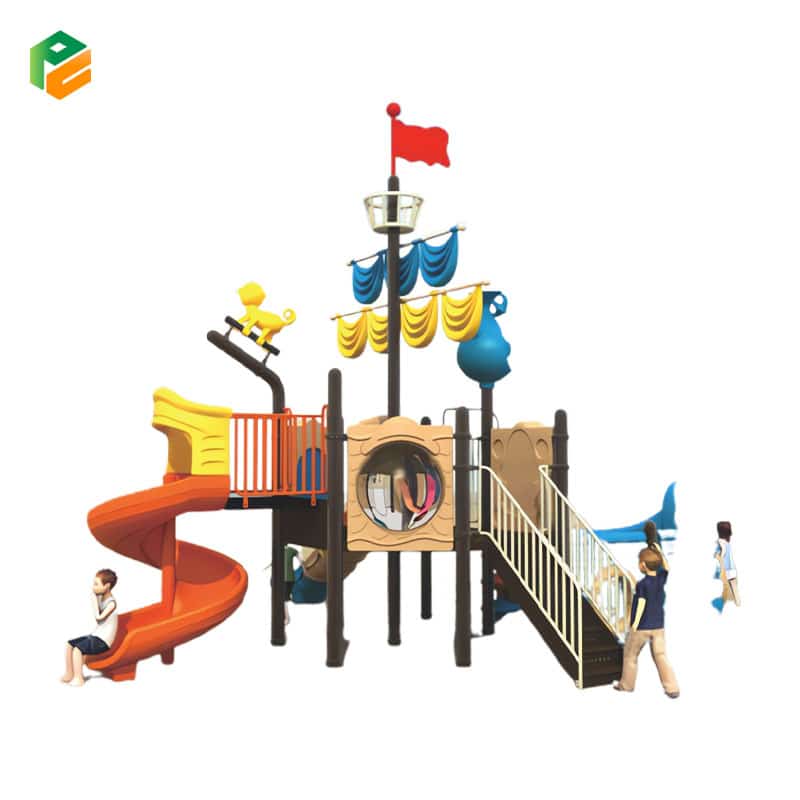 The pirate ship-themed playground set is a thrilling and imaginative addition to parks and resorts. Shaped like a majestic pirate ship, it beckons young adventurers to embark on a high-seas adventure. This dynamic playset includes a spiral slide for daring descents, a single slide for quick escapes, and plastic climbing discs leading to the ship’s platform, fostering agility and balance. Children can channel their inner pirates as they climb, slide, and explore, creating unforgettable play experiences in a safe and exciting outdoor environment.