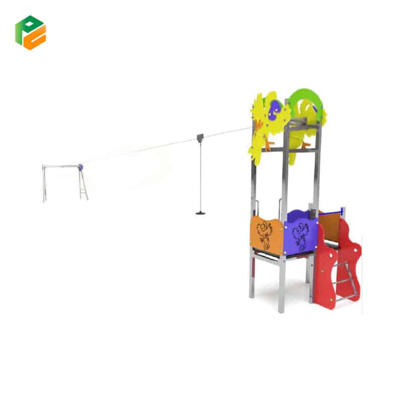 The playground cableway features a galvanized steel pipe structure. Adorned with vibrant panels, the departure structure boasts a spacious platform serving as a launching pad. Positioned at a height of 1.4m, access to this platform is facilitated by a ladder. On the other end, the arrival structure is outfitted with a robust shock-absorbing braking system, ensuring a smooth and safe landing for the cableway trolley.