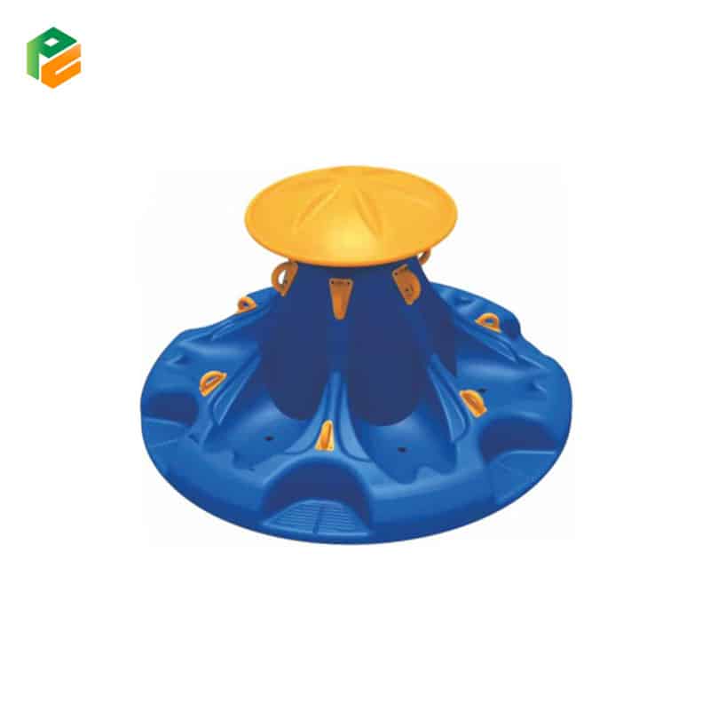 Large conical rotating body with integrated seating; Circular base platform; Top steering/support cap; Multiple integrated safety grab handles; Heavy-duty internal rotation mechanism |