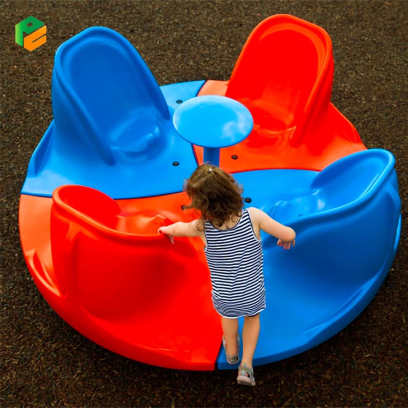 Ergonomic high-back seating for torso stability during rotation; Central disc provides a secure, shared grip point for all riders; Non-slip textured platform surface; Fully enclosed base and mechanism to prevent finger or limb entrapment |