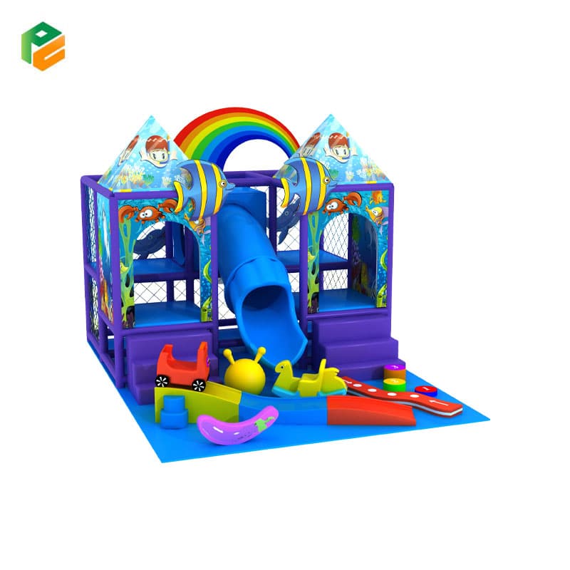 Core Components Two-level climbing grid, central blue tube slide, dual entry staircases, rainbow arch decorative header, pyramid-style thematic roofs, ocean-themed graphic panels, and a front-facing soft play mat area featuring a toddler mini-slide, rockers, animal hoppers, and a balance pathway