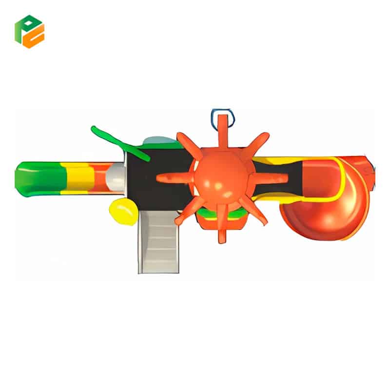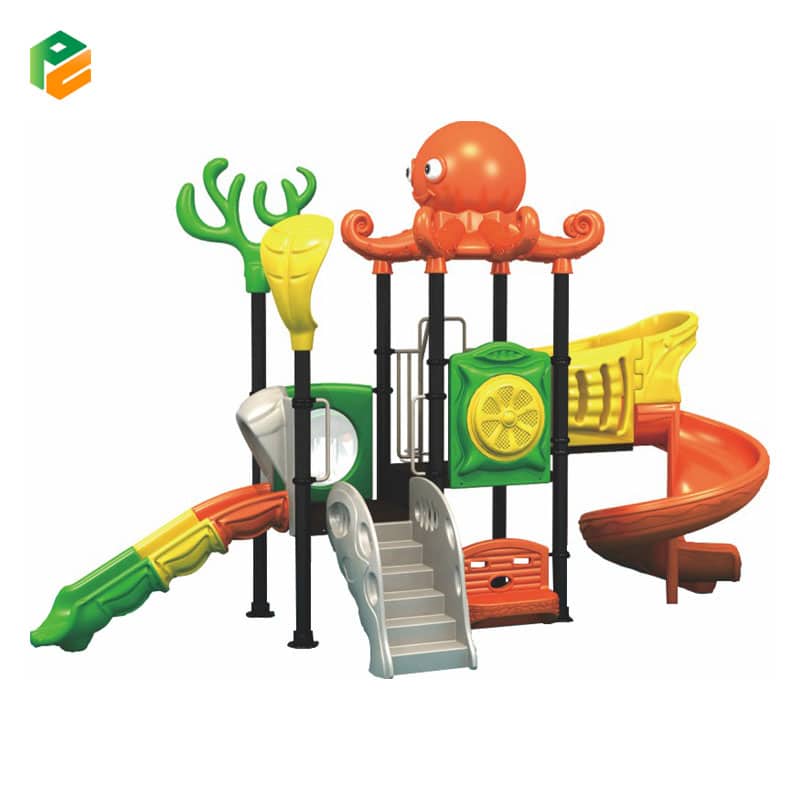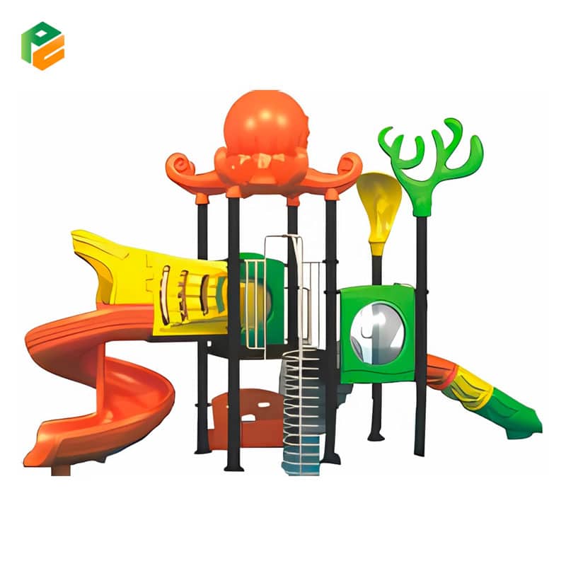 This school playground equipment is a captivating play structure with an octopus-themed roof, adding a touch of marine adventure to the play area. It features a thrilling spiral slide for exciting descents, a classic single slide for traditional fun, and a sturdy plastic chair for relaxation or imaginative play. This combination offers students a diverse and engaging outdoor experience right on their school campus.