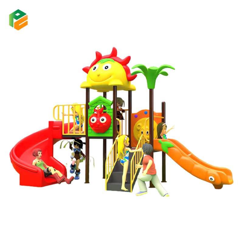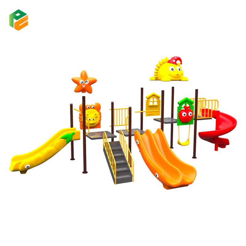| Core Components | Yellow “Sun” roof with a red cap/flower topper, orange starfish pole topper. Orange double-lane straight slide, yellow single wavy slide (with green leaf detailing), red spiral slide. Single yellow belt swing mounted beneath the platform. Central wide-step access stairs with yellow safety handrails. Green barrier panel featuring a 3D red apple face, orange lion/crab barrier panel, yellow house-shaped panel, and non-slip square platforms |
