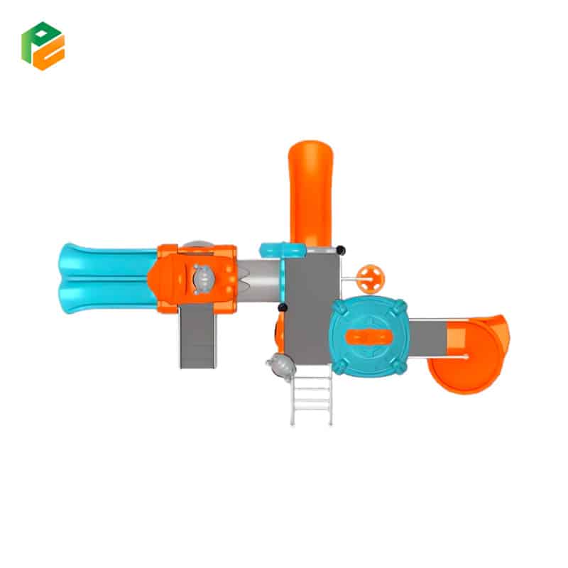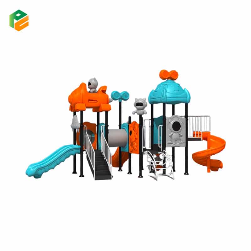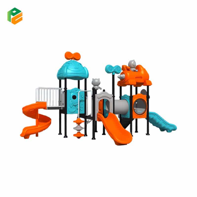 | Core Components | Orange “spaceship/jet” roof featuring a grey astronaut, blue dome roof with an orange propeller/radar topper, grey rocket ship and astronaut pole toppers. Blue double-lane straight slide, orange single straight slide, orange spiral slide. Central grey cylindrical crawl tunnel. Wide-step access stairs with white safety handrails, white metal arched loop climber. Under-deck vertical spinner with colorful discs. Grey barrier panel with an astronaut graphic, blue barrier panel with a rocket ship graphic, and non-slip square platforms |