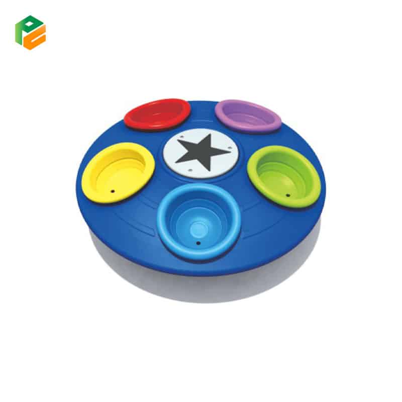 Large rotating UFO-shaped circular platform; Five integrated deep-set bucket seats in contrasting colors; Central decorative star-plate (serves as a grip point); Heavy-duty internal bearing assembly |